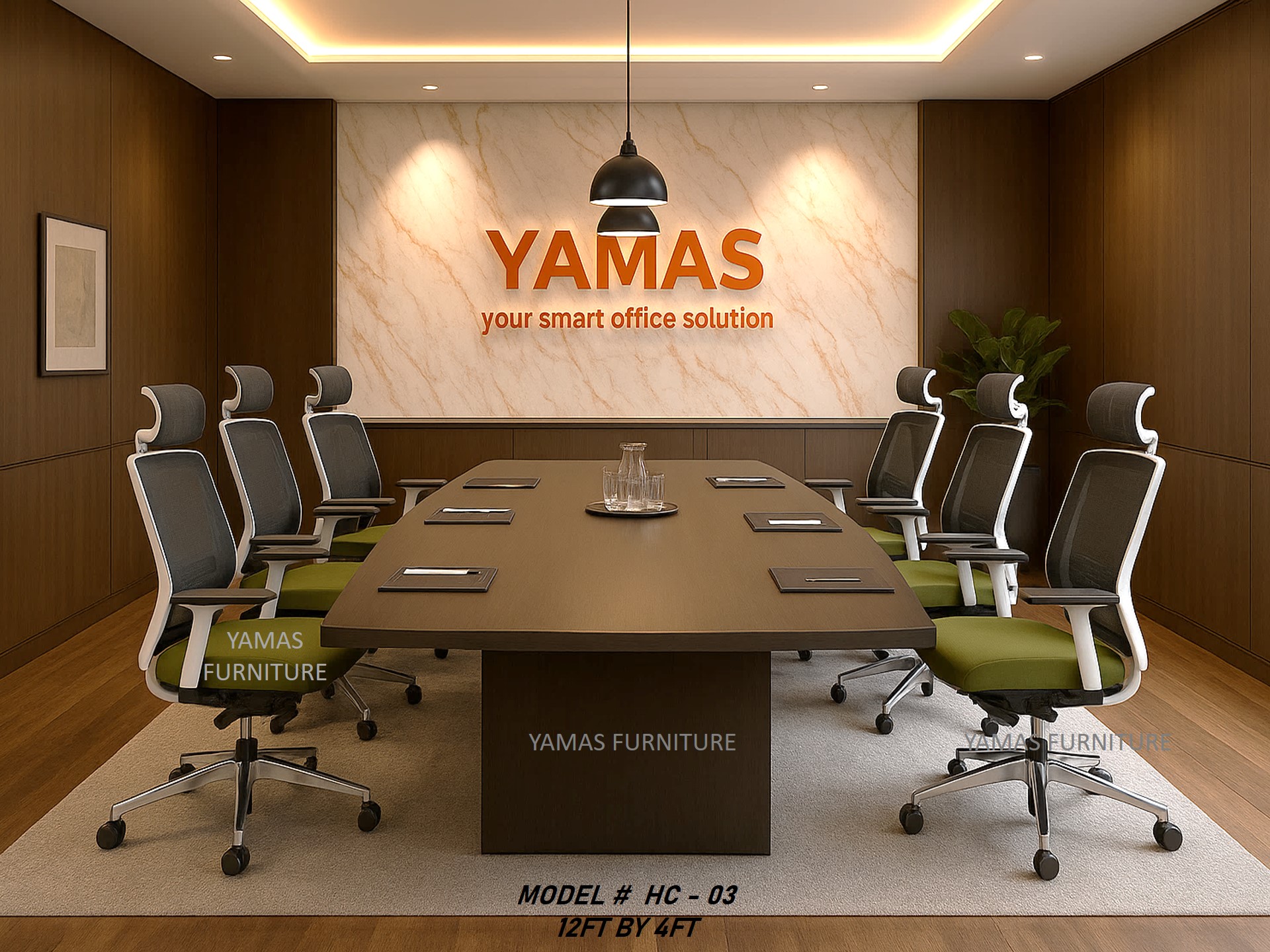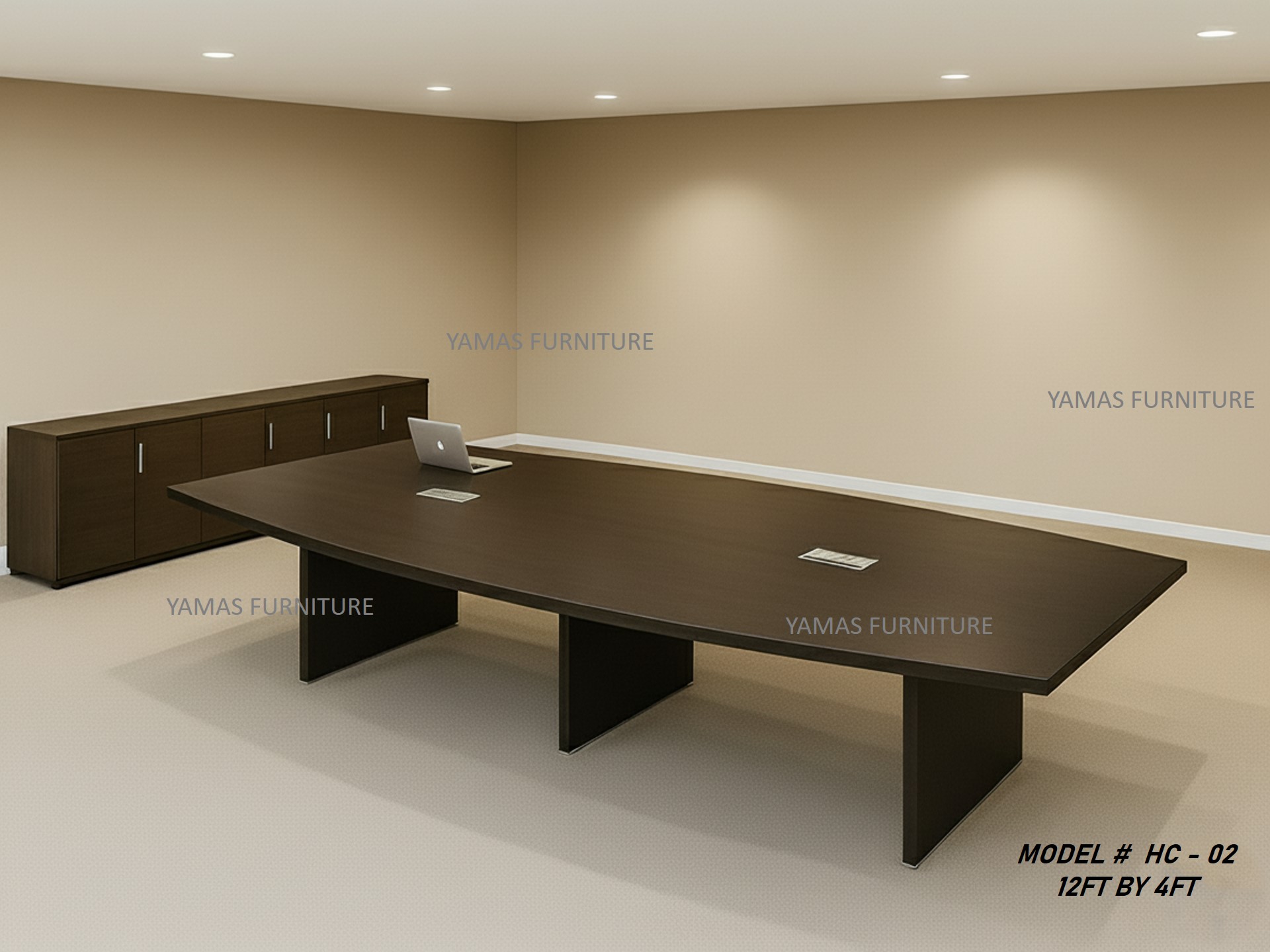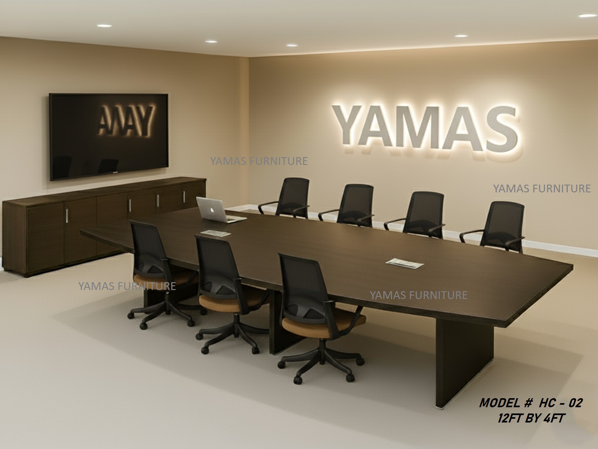 - “Illuminate Your Boardroom:” The Yamas HC-02 defines contemporary luxury with its crisp 12ft all-brown design. This minimalist executive table instantly brightens any space, projecting a clean, forward-thinking corporate image.
